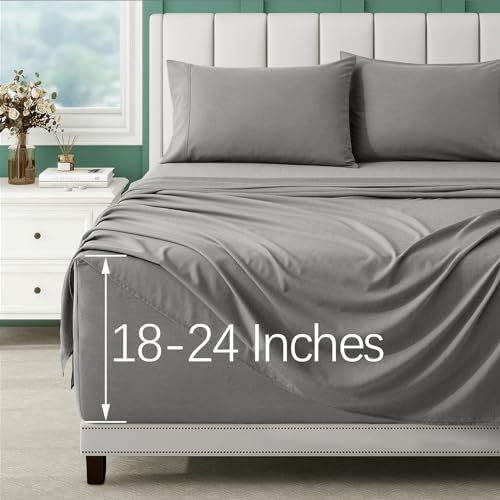 Our extra deep pocket sheets fit mattresses up to 18-24 inches deep. Available in Dark Grey, Aqua Blue, White, Black, and Light Grey, you can choose the perfect color to match your bedroom decor. The fitted sheet’s elastic edges ensure a secure fit around your mattress.